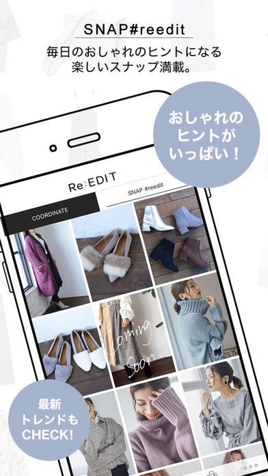 モデルや店員のリエディで販売されているアイテムを使ったコーディネートが閲覧できるので、商品情報だけではわかりにくいアイテムも着用時のイメージがつきやすくなって購入の参考になります。