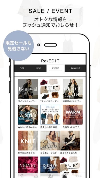 リエディに関する最新ニュースが更新された時やクーポン配布時、限定セール開催時などをプッシュ通知でお知らせを受けとることができるので、お得なタイミングを逃さず買い物ができます。