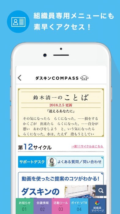 アプリトップページから最新のコンテンツや情報をスムーズに閲覧することができます。活動ツールなどを利用できる組織員マイページにもアプリから素早くアクセスすることができて便利です。