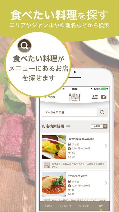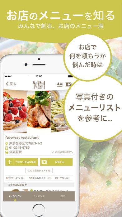 「おいしいレストランを知りたい」「このおいしいレストランをみんなにも知ってほしい」そんなレストラン情報を共有できる料理レコメンドアプリ「favoreat」。 実際に食べた人が感想やコメントの投稿している料理数はなんと約70,000品! 料理の感想や、人気のメニューやお店がわかるランキングも掲載されているので、 今までレストラン選びで困っていた人の強い味方になってくれるはずです。 そして気に入ったお店があったら、投稿してみんなにもオススメしちゃいましょう。 投稿された料理を見た人がお店く、おいしい料理やお店が「favoreat」で広がっていきます。 いつもの外食はもちろん、記念日のディナーや飲み会などに活躍してくれそうなアプリです。
