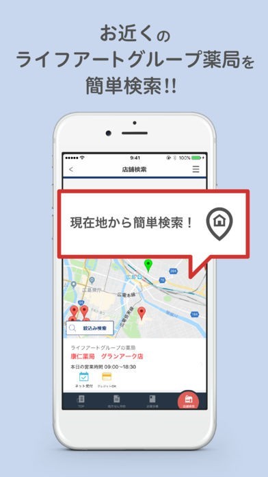 LAGアプリで、お薬を受け取りたい店舗を選択し、調剤予約ボタンを押します。