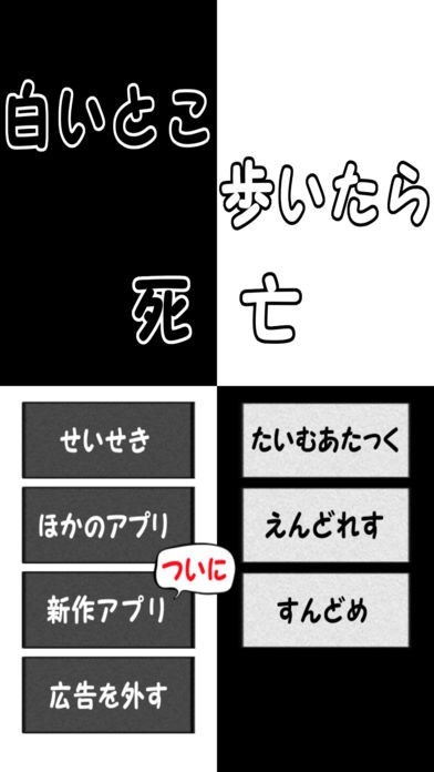 小さいときに誰もが一度は遊んだことがあるであろう遊び!それが道路で白い所を歩くと死んでしまうというルールの一人遊びです。 白いとこ歩いたら死亡はそんな子供時代の妄想をゲーム化したアプリです。ルールは白い所を踏むことなくどこまで歩くことができるかのみです。タイムアタックモードやエンドレスモードなど様々なモードが用意されています。特に変わったルールがすんどめです。10秒以内ならどれだけでも歩いても良いというチキンレース的な要素が取り入れられているハラハラドキドキのモードです。