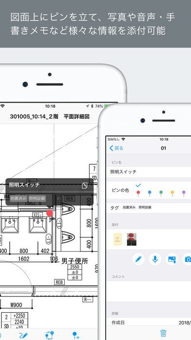建設サイトのアドオンアプリです。図面の気になるところにピンを立てることができたり、作業性が広がります。