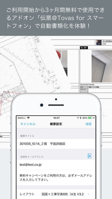 WEBサービスの「伝票@Tovas」との連携機能もこのアプリの魅力です。「Field Pad」での記録を、レイアウトを選択しメール送信することで、「伝票@Tovas」を通じて帳票化されます。
