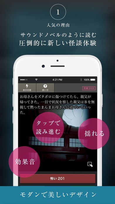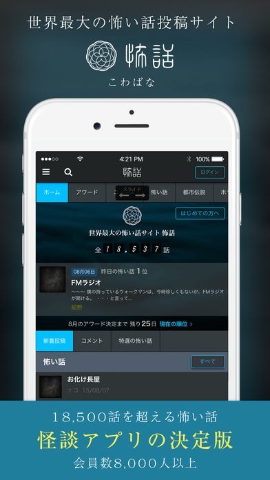 App Storeより引用怖い話・ホラー漫画が1万8000話以上楽しめる世界最大の怖い話アプリ。世界最大の怖い話コミュニティの会員が選んだ最も怖い話を無料で読むことができます。
