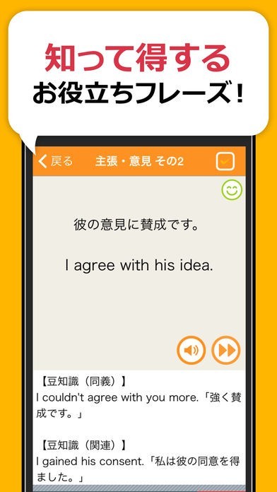 「英会話フレーズ1600」は、日常でよく使う英会話や知ってて得するフレーズなど全1610フレーズが用意された英会話アプリです。 フレーズには全てに音声も収録されており、繰り返し音声を聞いてリスニングのスキルアップにも活用できます。 重要な英会話フレーズはチェックしておくことで反復学習することも可能です。