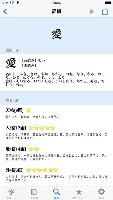 男女合わせて50000種類のデータが登録されているので、参考データが多い分決めやすいですよね。また、使いたい漢字や読み方で検索がかけれるところもこのアプリの利点と言えます。