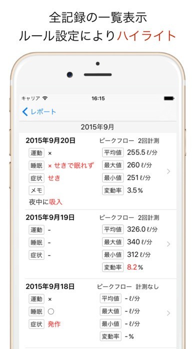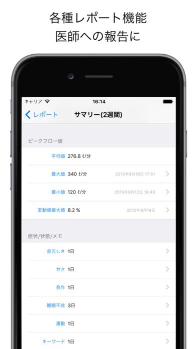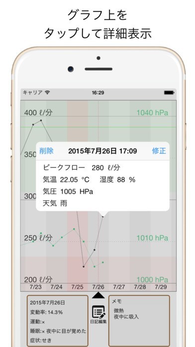 喘息で悩まされている人は、気象が悪いと症状がひどくなる傾向にあります。これは、医学的な見解はまだ裏付けされていないのですが、このように訴える患者さんが多い以上、無視することはできません。しかし、気象データは天気を勉強している人じゃないと把握できないので、素人には難しいのが実情です。そこで役立つのが、このアプリです。気象データを自動取得してくれるので、難しい文章を自分で入力する必要はありません。そのデータをグラフ表示して、ピークフロー計測値と比較 。気象データと体調の因果関係が少しでも把握できれば、安心して外出できるので重宝するでしょう。
