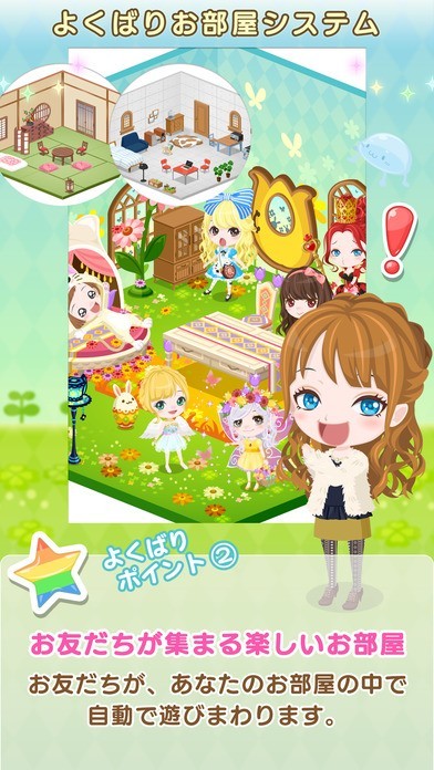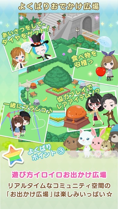 アバターの着せ替えとお部屋のインテリアはガチャでアイテムを集めます。庭は育成ゲームの要素が強く、栽培ポイントを耕すアイテムなどは、広場でタスクをして拾ったり、やりこみ型の要素もあります。交流広場には、アバターが集まっていますので、交流も楽しめます。着せ替えアプリとしては、やれることを詰め込んでいる印象があります。隙間時間に楽しむというのでは、時間が足りないので、ゲームを楽しむ時間をしっかりとって遊ぶタイプのアプリです。タスクが多いので、全部消化しようとすると大変なので、重点的に楽しむ部分を決めるのも一つの方法です。アバターのスタイルが、他のアプリと明らかに違うので、アバターが好みの人はハマると思います