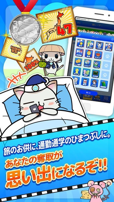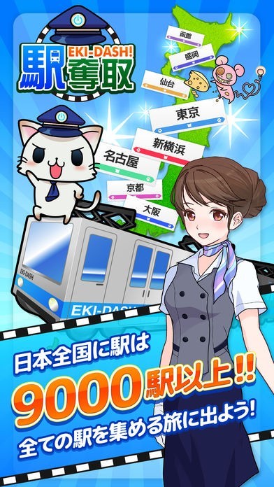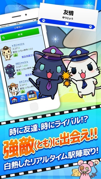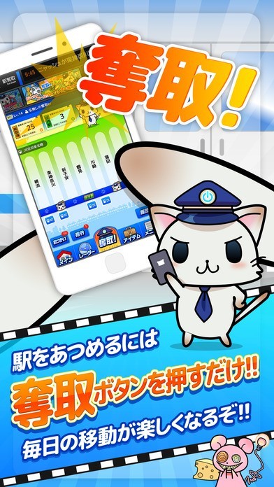 全国9千以上の駅に対応している「駅奪取」は、猫型ロボットのニャッシュと一緒に駅の陣取り合戦を行うGPS位置ゲームです。奪取を目的に駅へ行くというプレイスタイルもありますが、アプリ内の奪取ボタンを押すのみですので、通勤通学やショッピングの移動中でも構いません。通信環境にもよりますが、正常な場合は数秒で済ませることが可能です。駅取り合戦という性質から、ユーザーが多い大都市の駅は数秒で奪われるシーンが多々あるため、奪還ブロックのチーズや自動奪還のバッテリーなどを駆使して守りましょう。また、観光や出張といった旅行時は取得駅を増やすチャンスですので、コツコツ登録がポイントです。ただし、無制限で駅が取れるわけではありませんので、ニャッシュのスタミナ回復アイテムや着せ替えなどを組み合わせて有利にプレイしましょう。