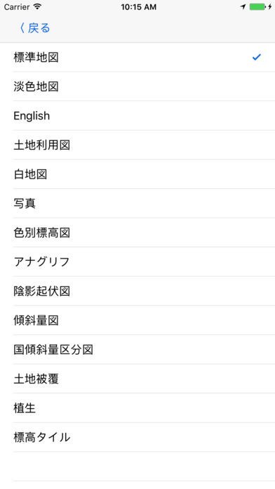 App Storeより引用国土地理院の地図を表示します。標準地図・淡色地図・English・土地利用図・白地図・写真・アナグリフ・陰影起伏図・傾斜量図・全国傾斜量図・土地被覆・植生・標高タイルが表示できます。