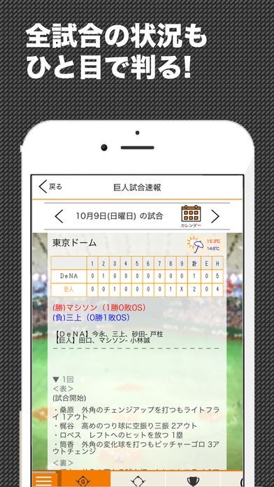 イニング毎の経過で得点シーンもリアルに表示。気になる他球場の状況、CS、日本シリーズも楽しめます。カレンダー機能で、スケジュールも過去のデータもすぐに確認可能です。