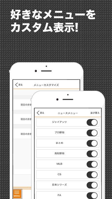 メニューを好きな順番に表示して使いやすく! ニュース、速報、応援メニューの並び替えと表示・非表示が自由に変更できます。