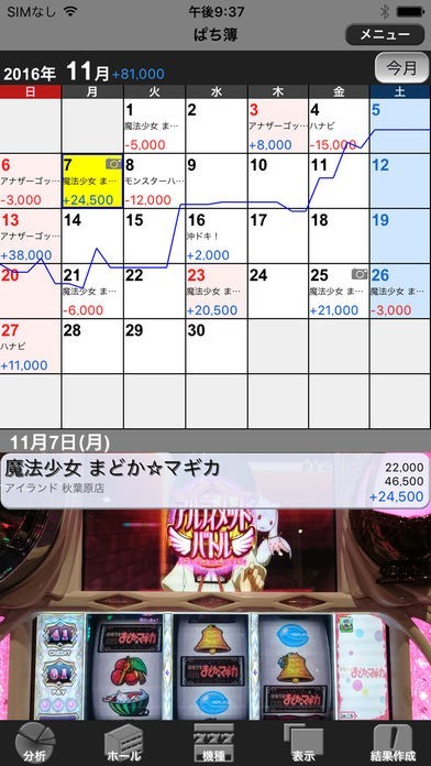 ホールメモ機能が搭載されているので、良く行くホールの癖や特徴をメモしておくことが出来ます。また、月の収支をスランプグラフ化してくれるので一目で結果が分かりますよ。