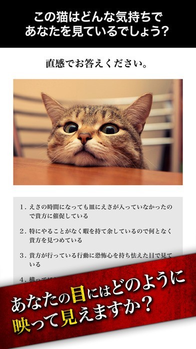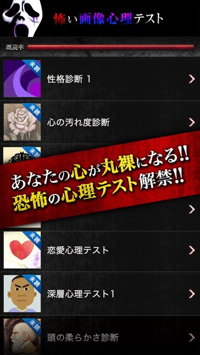 ホラー風なアイコンが、凄く印象的なアプリケーションです。特に、ムンクの酒びたしみたいなキャラクターイラストが、恐怖感を与えるような雰囲気があります。実際に、ゲーム内もホラー風なものが多数導入されているため、心臓の弱いかた、怖いのがめっきりダメなかたなどには、あまりおすすめできないアプリケーションだと思います。やり方としては、凄くカンタンです。指ひとつでのカンタン作業なので、忙しいかたなどにはスマートに出来るアプリケーションだと思います。診断も、複数ある選択式での回答形式であるため、気楽な気持ちでプレイできます。また、無料サービスなのでお金の心配もなくプレイできて良いと思います。