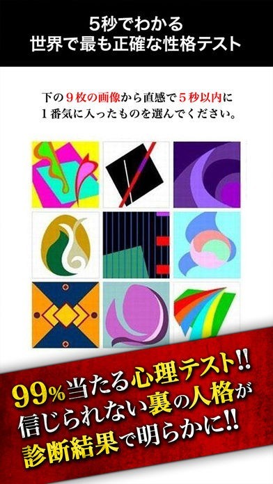変わった占い方法で心理を占いたい人は、このアプリがおすすめです。この占いは、200点以上の恐怖画像を元に、あなたの心理状態を教えてくれるものです。そこから導きだせるのは、恋愛、性格、ストレス、オタク、汚れ、サイコパス、頭の柔らかさ、脳のタイプetc。このように多岐にわたっているため、「いろんな占いアプリをダウンロードするのは面倒くさいから、一つのアプリで酢酸占えるアプリを探している」なんて時に使っても活躍してくれるでしょう。また、「画像が200点以上」という概要からもわかるように、画像の種類はかなり豊富です。「こんな画像もあるんだ!」という発見が得られるので、暇つぶしアプリとしても活躍してくれるでしょう。