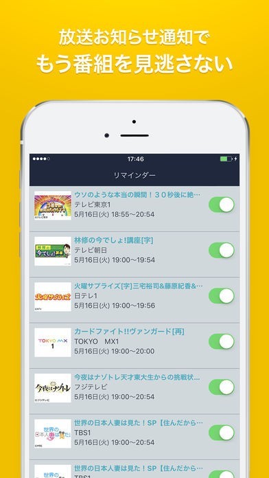 リマインダー機能でお気に入り番組の開始前にお知らせをしてくれる!