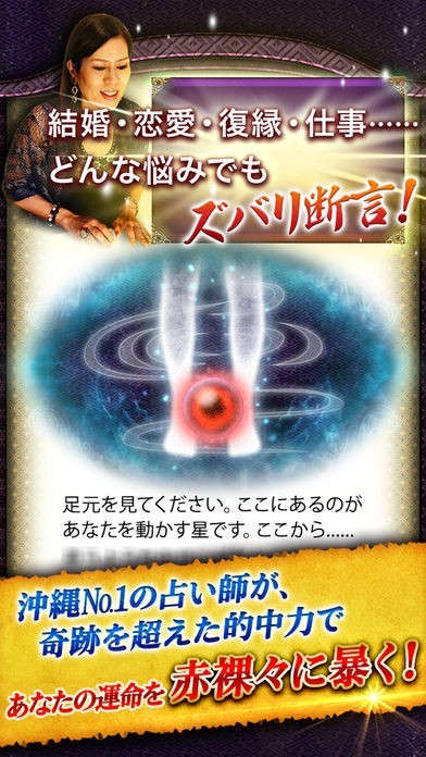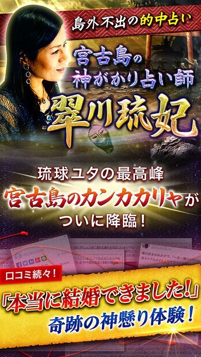 宮古島伝来の占い師翠川琉妃に占ってもらえるアプリです。恋愛や仕事など、あらゆる悩みの相談が可能です。幼い頃から霊能力を授かりカンカカリャと呼ばれる先生の驚きの高的中率鑑定を体感できます。