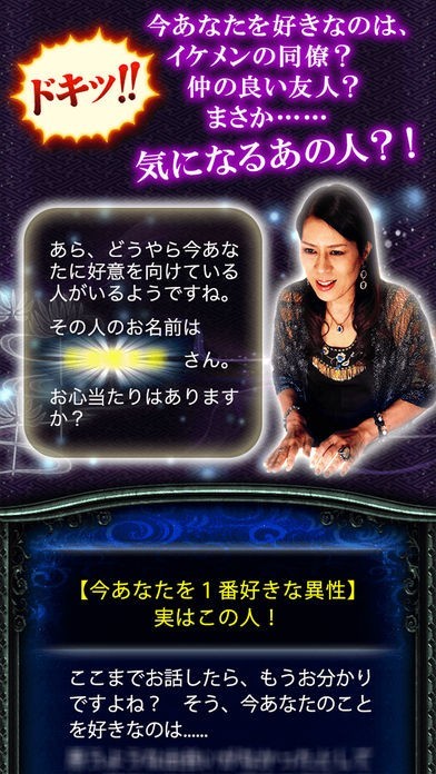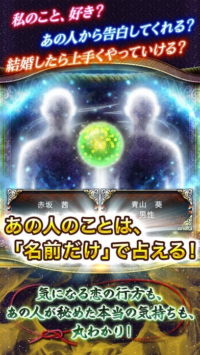 神秘の占いは気になる相手の名前だけで占うことができます。あなたに気を向かせる方法や相手の本質まで答えを出し、悩める恋愛の悩みの解決になります。もちろん、これから先の運命の相手も占ってもらえます。