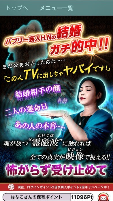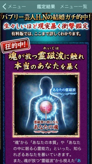 口コミで予約殺到の人気心霊師SHIN-HAの鑑定を受けれるアプリです。その占いは、ある有名芸能人の結婚を的中させてしまい各TV局に恐れられたほどです。驚異の的中率を体験してください。