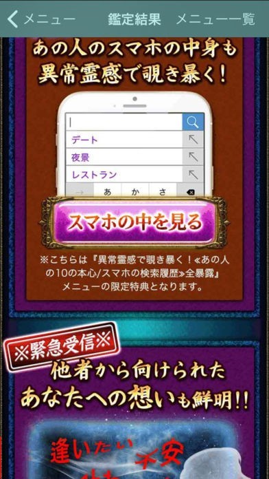 メニュー機能があり、恋の行方や運命の人などたくさんある