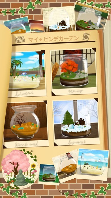 瓶を選んで霧吹きで定期的にお水をかけてあげると、だんだんお庭ができあがっていく育成ゲームです。どんなお庭になるかは完成するまでのお楽しみで、やり出すと愛着がわいてついついお手入れしたくなっちゃうのでスキマ時間のヒマつぶしにも最適です。