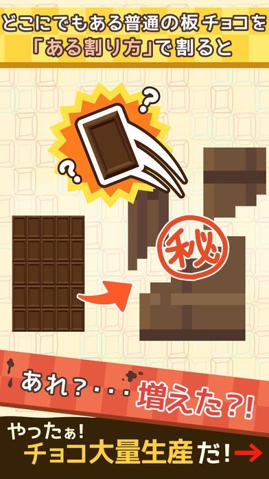 無限チョコ工場は、どんどんチョコレートを増やしていくゲームです。チョコを連打タップをしたり時間が経過することで、急激にチョコレートが増殖していきます。板チョコには、色々な味がありミルクやビター、イチゴなど購入するとチョコ粒が増えていきます。板チョコをタップすると、割れて形が変わり1粒増えます。フィーバータイムがあります。大量に増産できるタイムです。板チョコをスワイプしていくだけで、どんどん増えていきます。 チョコを増やすために、生産機を買う方法もあります。ショップには、カカオや搾乳機などのアイテムが売っています。アイテム購入で、時間が経つとチョコが増えています。チョコ好きにはうれしい夢のような気分で遊べます。