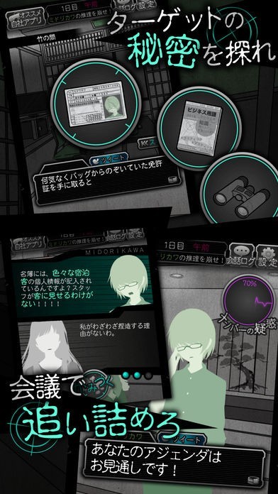 前作からの追加要素として共犯者の存在があります。共犯者と口裏をあわせてアリバイを作ったり、会議の流れを操ったりすることが可能です。さらに共犯者が疑われた場合の対処なども頭を悩ませます。