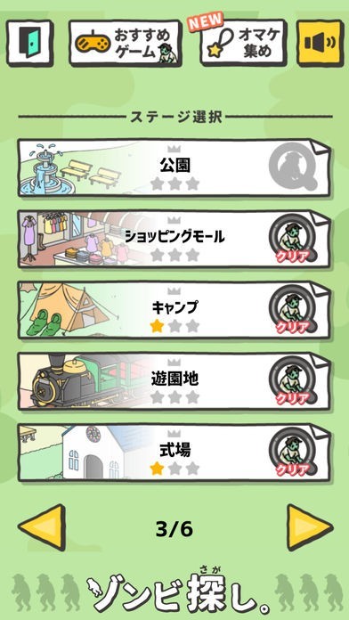 ステージによって難易度が分かれています。ステージ名の下の星が多いものほど難易度が高く、少ないものほど易しいです。ステージの舞台は日常生活で訪れる馴染のある場所です。
