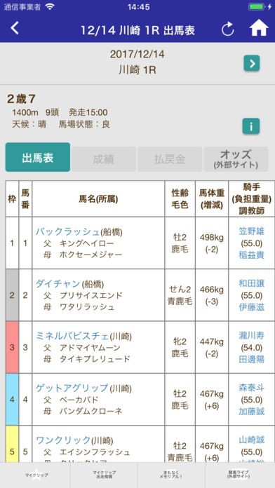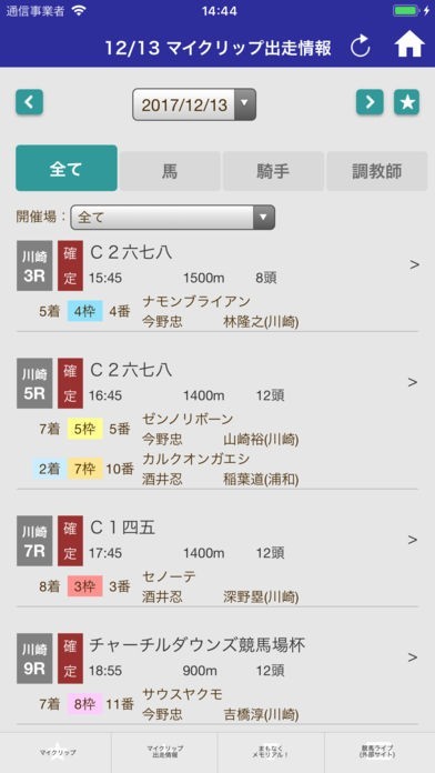 マイクリップ機能を使えば、レース前日には登録した馬や騎手の出走情報が、レース後は成績が通知されます。情報量の少ない地方競馬で、追っかけている騎手や馬の動向を洩らさずチェックできて便利です。