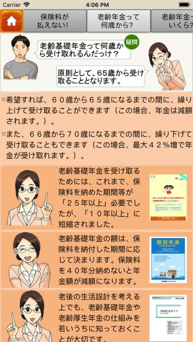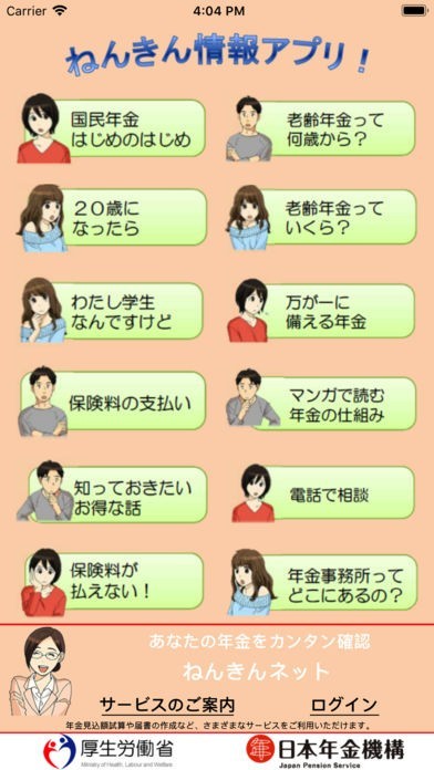 App Storeより引用このアプリは、主に20歳代の方を対象に公的年金制度の周知を目的としており、これだけは知っておいてほしい年金に関する情報を、動画や漫画とともに、皆様にお届けします。
