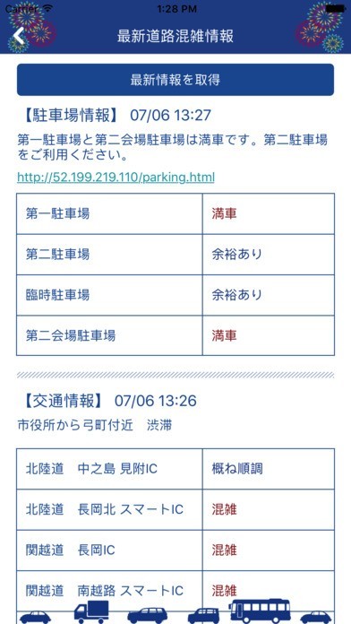 App Storeより引用『長岡花火道路情報』は、昨年の渋滞ピーク時間の情報、駐車場の利用状況や最寄りICの混雑情報等をプッシュ通知でお知らせするアプリです。自動車で「長岡まつり大花火大会」にお出かけになる前にインストールしておくととても便利です。