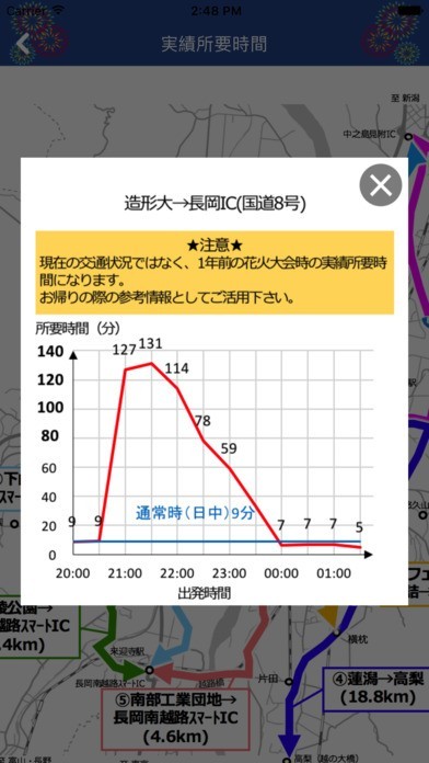 花火大会終了後、帰り道として使用される主要な経路の時間帯別実績所要時間を表示します。