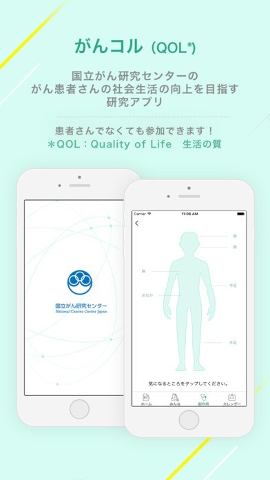 このアプリは、がん患者さんの生活の質を調査し、今後のがん患者さんの療養の向上を目指して作成されました。がん患者さん以外の方にもご利用いただけます。提供いただいたデータは患者さんのデータとの比較対照いたします。