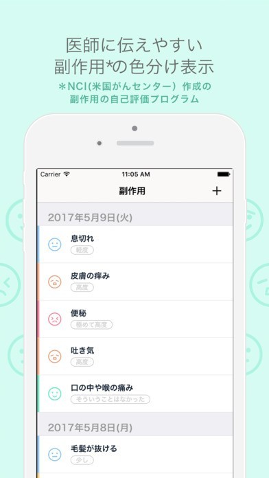 3.副作用が現われたら、副作用画面で症状を選択して、5段階で自己評価します。日々の記録をログとして保管します。