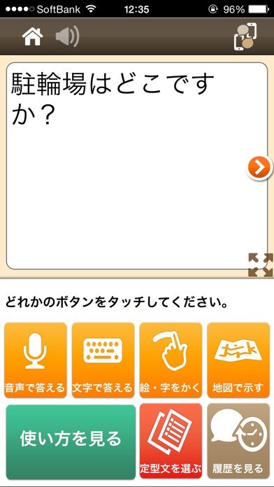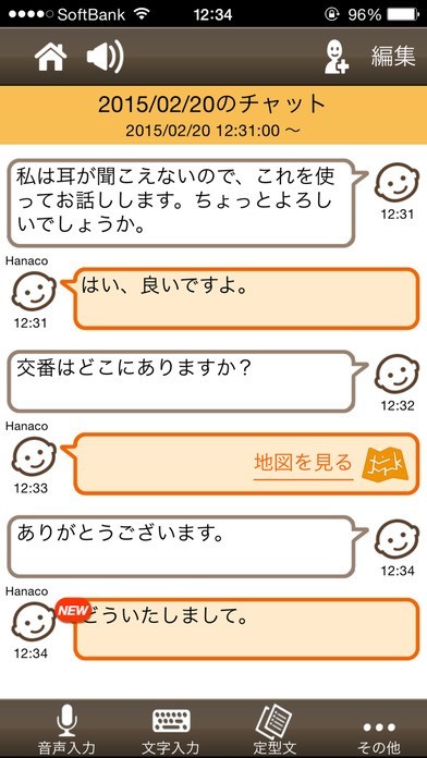耳が不自由な方のサポートをするためのコミュニケーションアプリです。細々としたボタンのクリックはなく、大きなボタンのクリックでスムーズに意思を伝えられるのが便利。音声、文字、絵、地図など、バリエーションの広い選択ができるのも嬉しいポイントです。さらに、定型文での回答もできるし、よく使う定型文は登録もできるから、再検索する必要はありません。また、チャットを使ったやりとりも可能なので、やり取りを後でじっくり見返すこともできるんです。