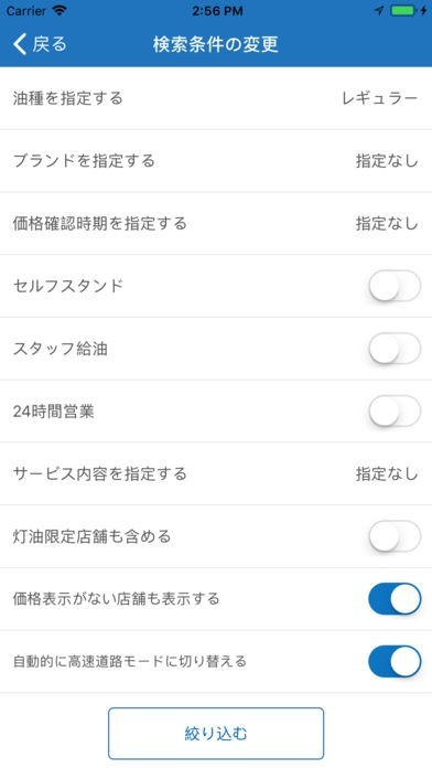 最安値を探すだけでなく、スタッフ給油やセルフ給油も検索条件で設定出来るため助かる