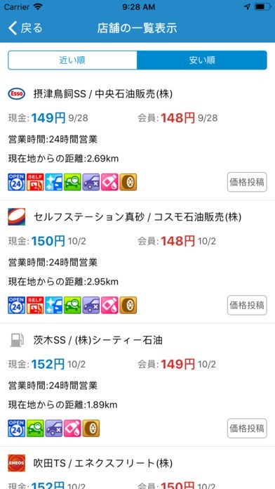 最寄りのガソリンスタンドも検索出来るだけでなく、値段の比較も出来るので地元でも出先でも便利