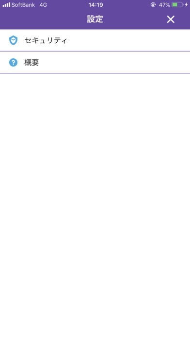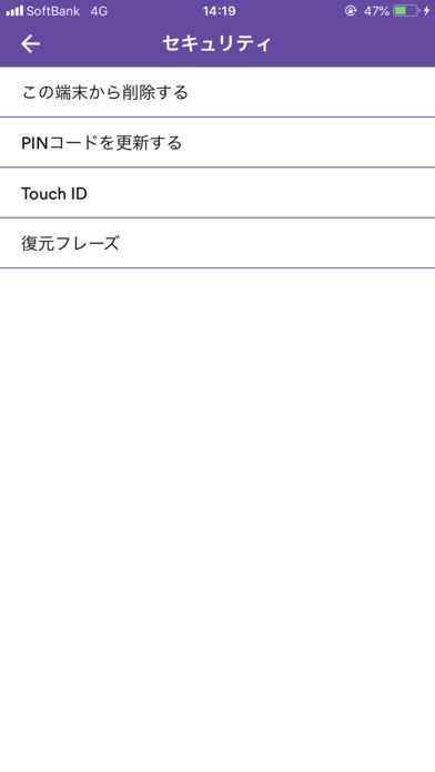 ・セキュリティ ウォレットの削除、PINコード変更、TouchID設定、復元フレーズ確認を行います。