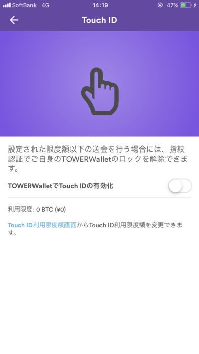 ・Touch ID ウォレット起動時の認証をTouch IDで行う様設定でき、一度に送金できる上限額の設定も行えます。