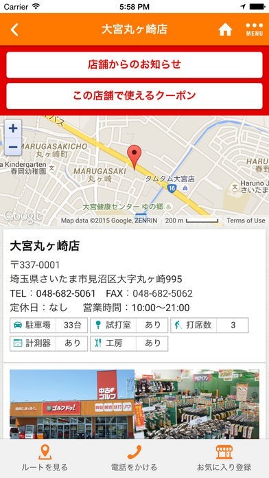 店舗情報では場所や営業時間の確認ができるほか、試打室や計測器の有無も分かるのでゴルフクラブを買うのに便利です。店舗検索も簡単で使いやすく、店までのルートも表示できます。