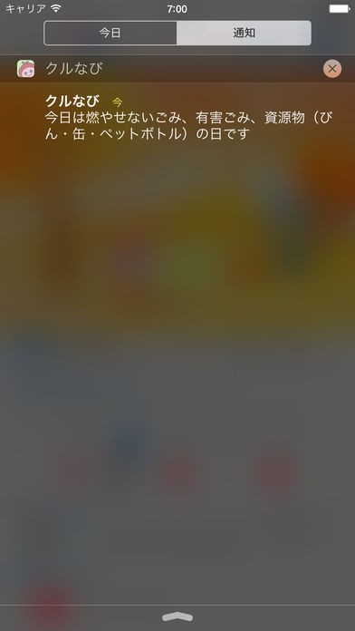 収集予定のごみ種別を前日と当日にアラートでお知らせします。時間は自由に設定することができます。