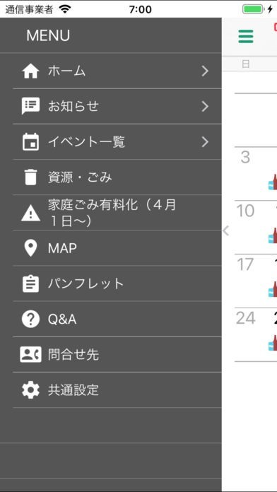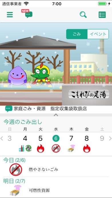 収集日変更のお知らせやイベント情報などを確認することができます。