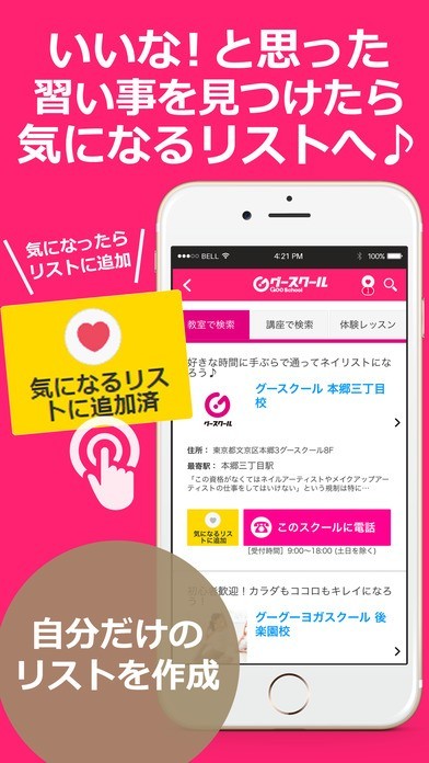 450種類以上、5万件以上のスクール情報が掲載されているアプリです。ジャンルや地域、資格名などで細かく検索することができるのでお目当てのスクールを簡単に見つけることができます。そのまま申し込むこともでき、お得なクーポンも付いています。スクールに関するオリジナルの記事が満載のグースクールマガジンも配信されているのでスクール選びの参考になります。 気になったスクールはワンタッチで気になるリストに登録できるので、手軽に候補リストが作れます。