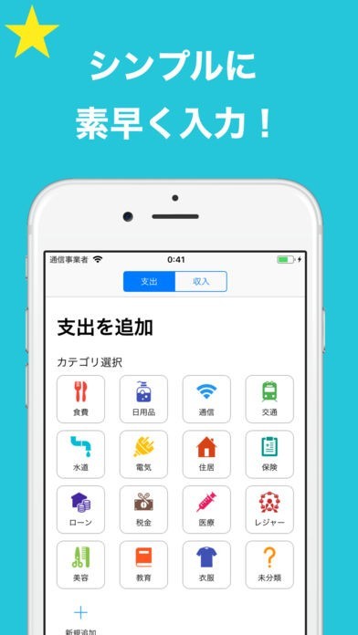 アプリには支出のカテゴリの一覧画面が用意されています。各カテゴリはアイコンになっており、タップすると選択することができます。素早く入力できるように工夫されています。