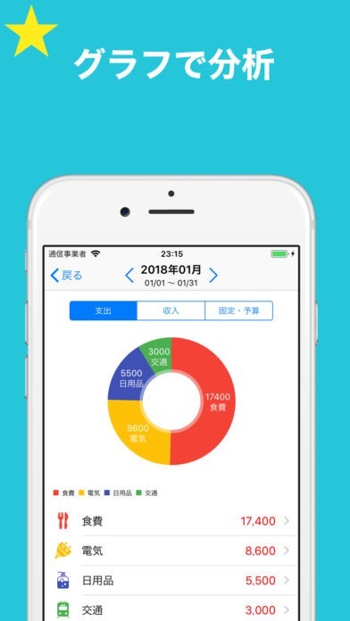1カ月ごとの出費を円グラフに表示することができます。食費、通信費、交通費など、使用用途ごとに表示されるので、家計の見直しにも役立つでしょう。色ごとに分けられているので、見やすいのも特長です。