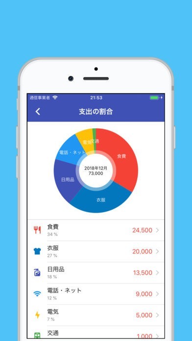 毎月・毎日の支出の推移を折れ線グラフで表示されるので、一目でお金の流れを確認することができます。また、支出の割合が円グラフ化されるので、食費や日用品など支出に占める割合を把握してムダを削減できます。