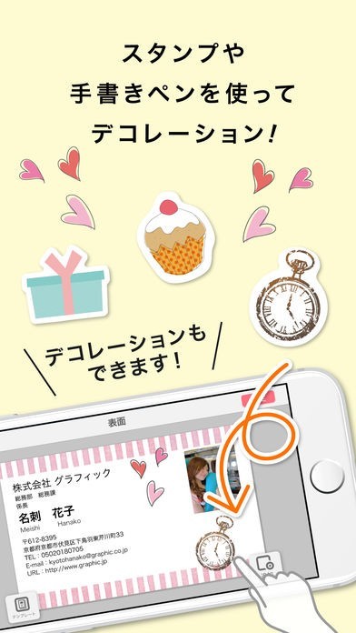 写真やかわいいスタンプで簡単にデコレーションしたオリジナル名刺も簡単に作成できます。