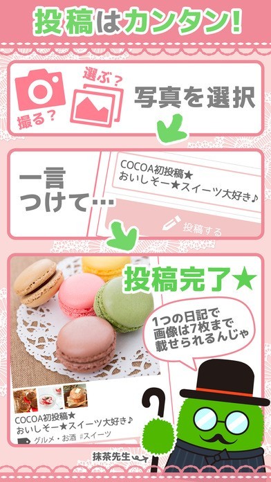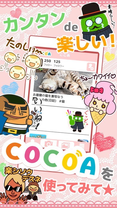 FacebookにTwitter、InstagramなどのSNSは、きちんとした文章を書いたりコメントを返さなきゃいけないのがちょっと苦手。 もっとお手軽に楽しめるSNSを探している方にぴったりなのが、「Cocoa」です! 写真を撮影したらあとは投稿すればいいだけだから、難しい文章は考える必要なし! かわいいデザインのスタンプもたくさん用意されているから、気分のままに使えます! 検索機能でお気に入りの写真を見つけたら、早速スタンプでコメントしちゃいましょう!