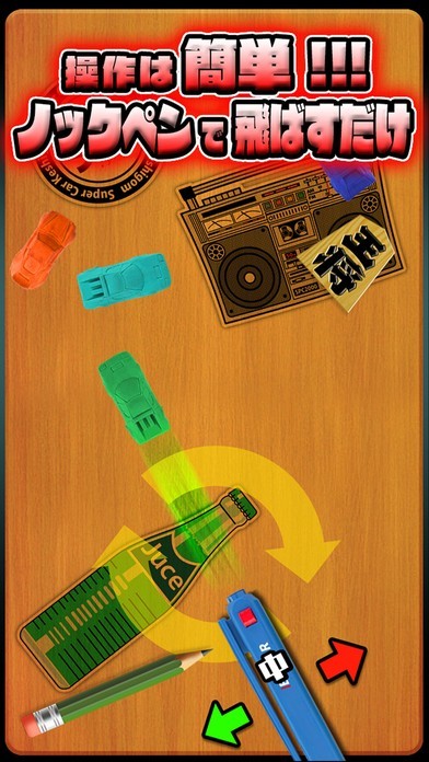 ノック式ボールペンの力で車の形をした消しゴムを飛ばしあって戦う「カー消し飛ばし」。ボールペンの方向はスワイプで調整し、パワーの選択とカー消しの押し出しはタップで行います。相手のカー消しを机から落とせば勝ちになりますが、有利に戦うにはちょっとしたコツがあります。ボールペンをしっかり相手の車の方に向けるのはもちろんですが、状況によって押し出す強さを変えるようにしましょう。相手が机の真ん中よ寄りにいる時は大のボールペンでガンガン攻めていき、相手が机の端に近づくにつれてパワーを落としていきます。こうすることによって、トドメを刺す時に勢い余って自分も一緒に落ちてしまうことを防げます。1ゲームにかかる時間は1~数分程度なので、細切れの時間を使って気軽に遊べます。